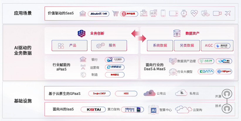 在基础设施层面,基于商业或开源的云原生就绪开发工具与技术组件(PaaS)和面向AI的底层公共基础设施资源(IaaS),将共同支撑企业完成数字化转型